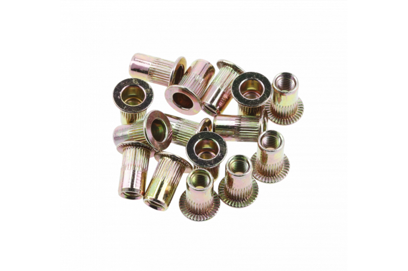 Stalen klinknagelmoeren worden gebruikt voor het permanent verbinden van elementen. Ze hebben een metrische draad voor gebruik onder schroeven en montageschroeven.