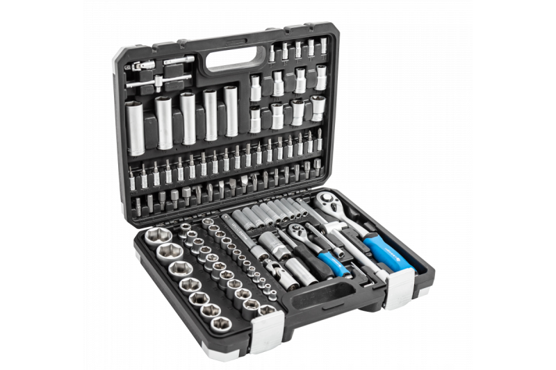 Complete set van 108 elementen bestaande uit ratels, doppen, schroevendraaierbits en andere 1/2" en 1/4" accessoires.